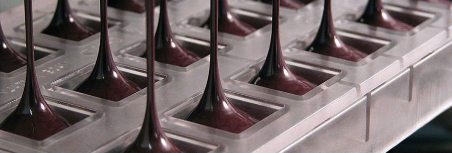 本机适合生产主要生产金币巧克力、板块巧克力、夹心巧克力、纯脂巧克力,包括模板加热、浇注、振动、冷却、卸料、和输送。